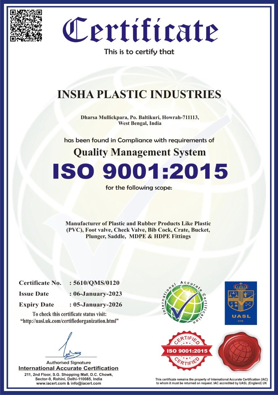 Insha Plastic Industries is an ISO 9001:2015 certified company for Quality Management System. The Company has also certified under Micro, Small and Medium Enterprise(MSME) and National Small Industries Corporation (NSIC)
